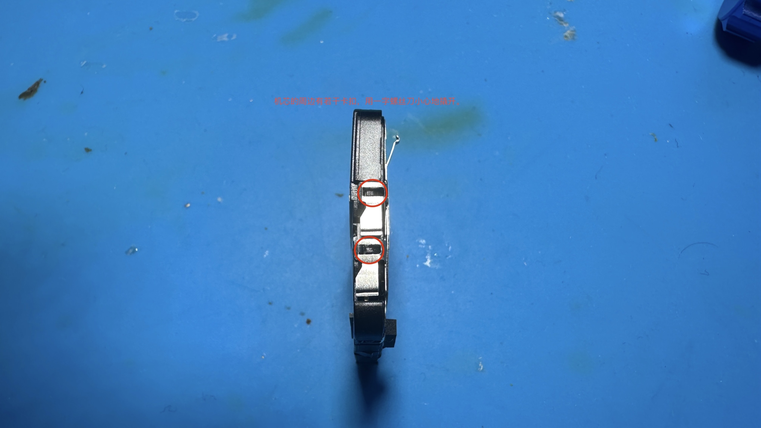 - 用一字螺丝刀撬动表芯上部,取出整个表芯。这一步务必小心,不要弄坏表壳和表芯。
