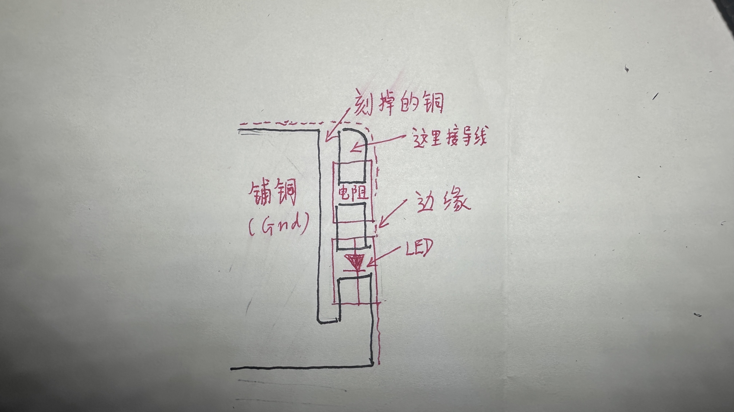 - 用刻刀在PCB如图所示的位置,挖去部分铜皮,刻出LED和限流电阻的焊盘,可以参看示意图(满级大佬都手绘示意图),这一步是最难的。注意PCB这个位置的铜皮连接的是电池负极(也是地平面),需要保留一部分焊接LED的负极。铺铜是小正方网格状的,可以切断某些横向或者纵向的正方形的边,建议用细mark笔在PCB上打好草稿再刻。可以用小台钳夹持PCB,雕刻的时候务必小心,注意不要刻坏或者夹坏PCB。